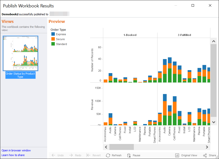 7. Click Ok, then Publish. You will see the Publish Workbook Results UI with a Preview of the published worksheet. Depending upon the data size, your network et al, Preview might take a few seconds.